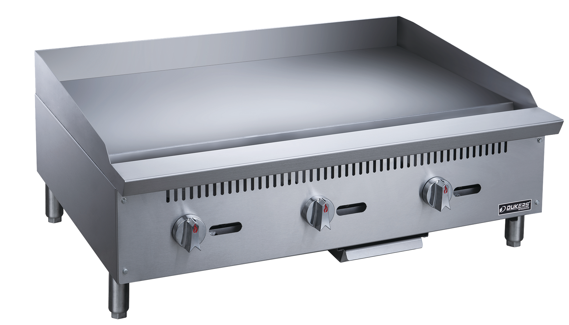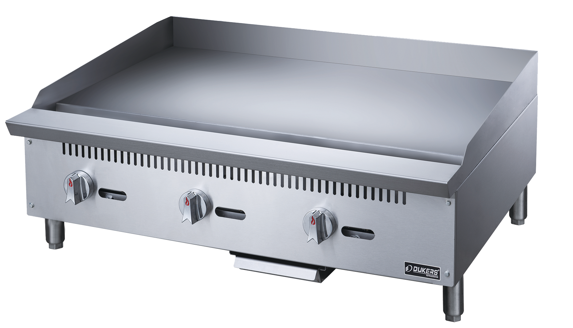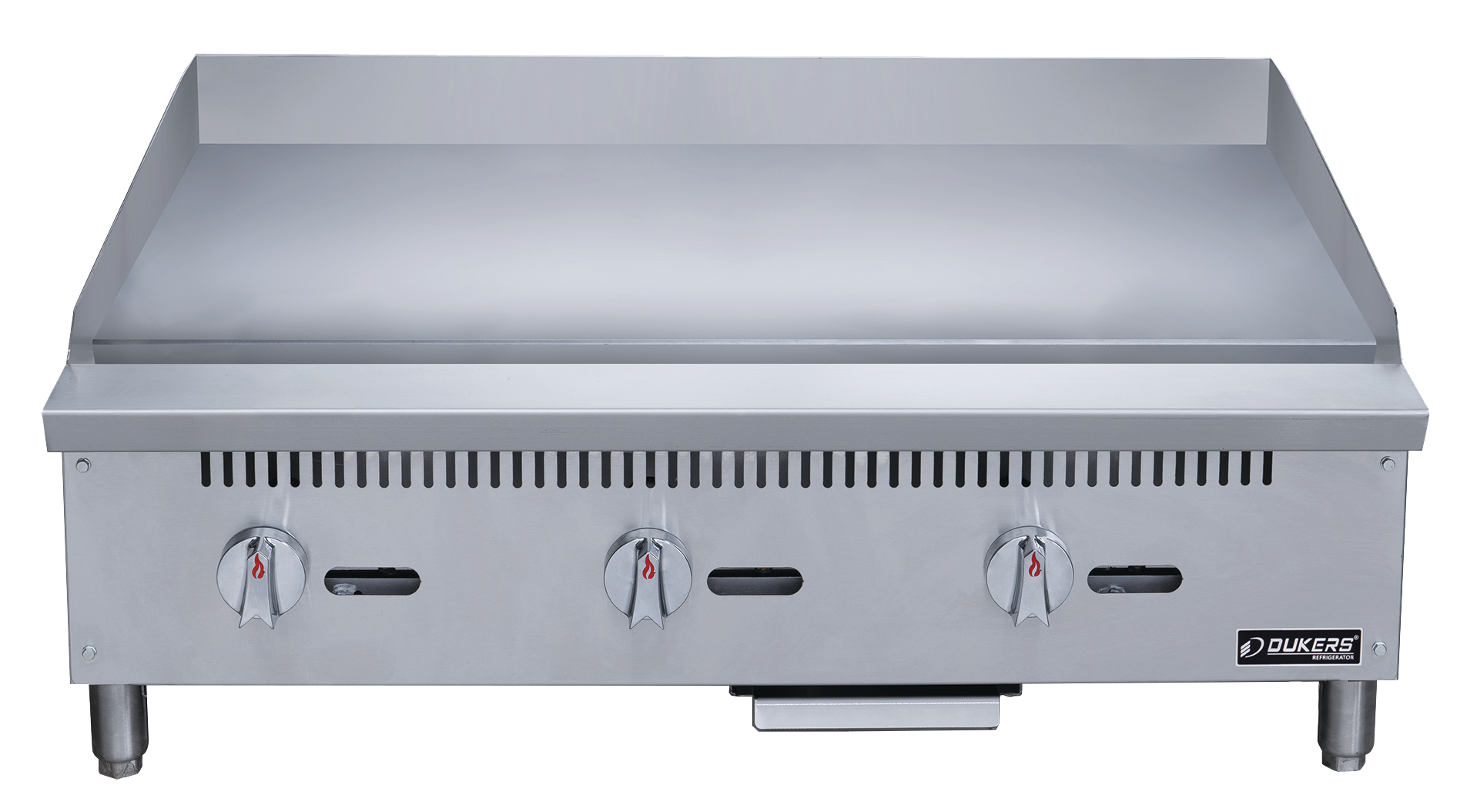 The Dukers DCGM36 36-inch W Griddle with 3 Burners offers exceptional cooking versatility and efficiency for commercial kitchens. With three powerful burners producing a combined output of 90,000 BTU/H, this griddle ensures rapid and even heating for consistent results. It is compatible with both Natural Gas (NG) and Propane, with gas pressures of 4” WC for NG and 10” WC for Propane, providing flexibility in installation. The spacious work area, measuring 35.86" x 20.50", accommodates large batches of food, ideal for high-volume cooking environments. Constructed with a durable stainless steel exterior and interior, it guarantees durability and easy maintenance. Featuring independent manual controls and adjustable stainless steel legs, it offers precise control and stability during operation. Each griddle comes with a heavy-duty 3/4” thick polished steel griddle plate and a full-length seamless drip pan, ensuring hassle-free cleaning. Additionally, it includes a 1-year parts and labor warranty, ensuring reliability and customer satisfaction.